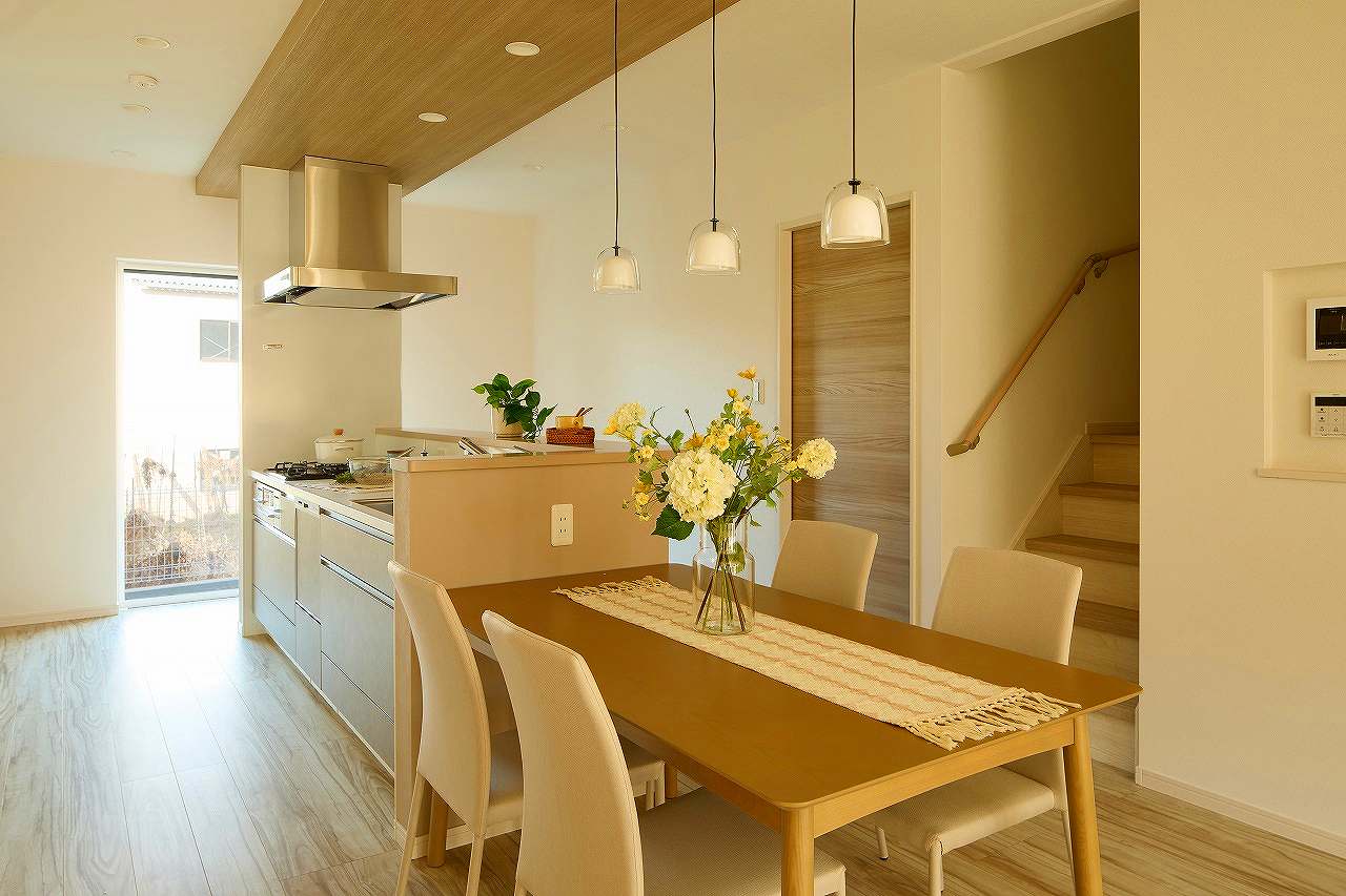 対面式キッチンやリビング階段仕様で、