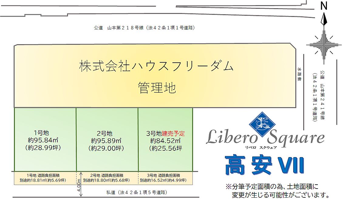 ※3号地:土地面積に別途道路負担面積約16.52㎡(約4.99坪)有