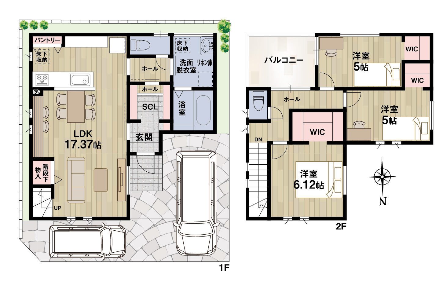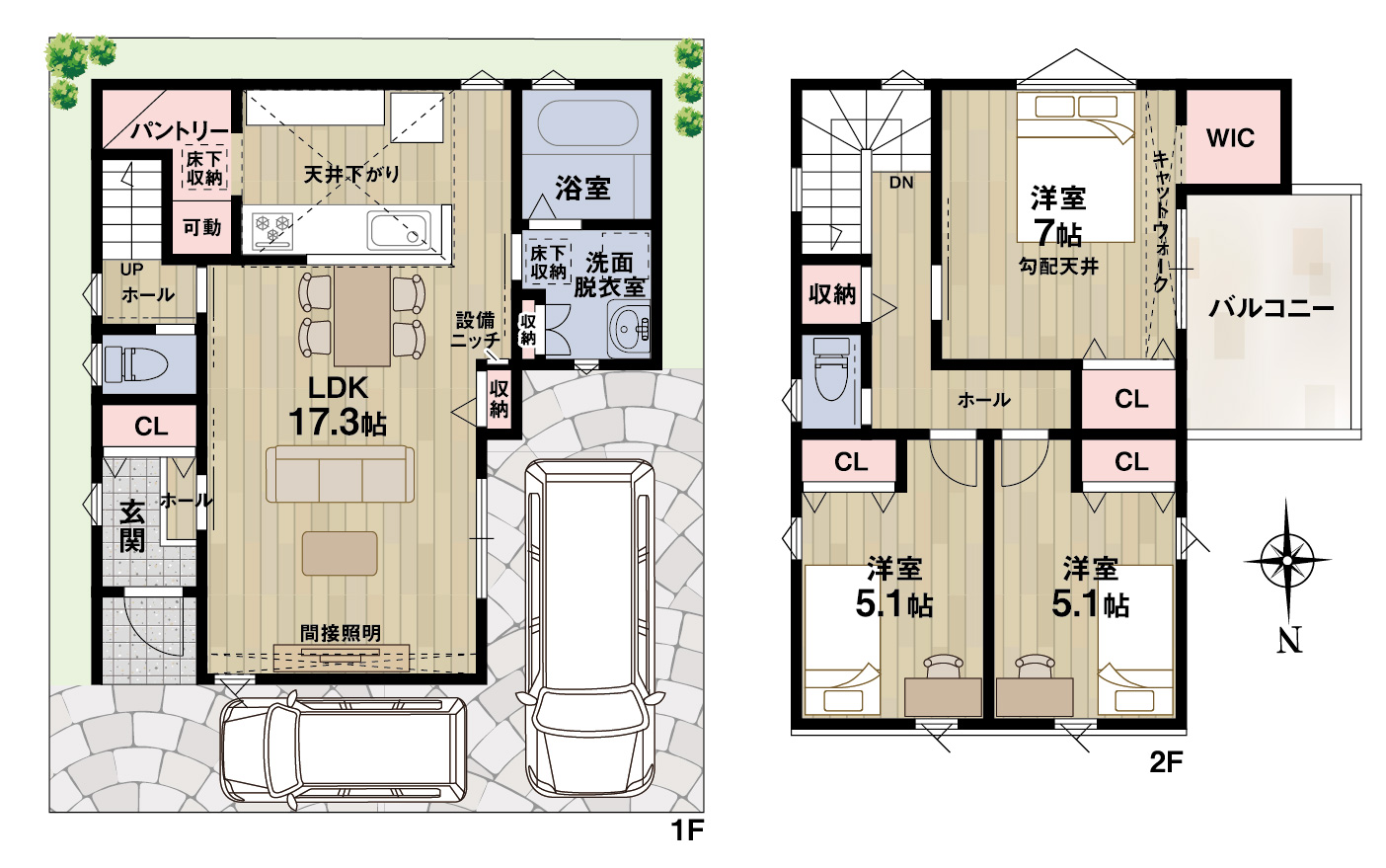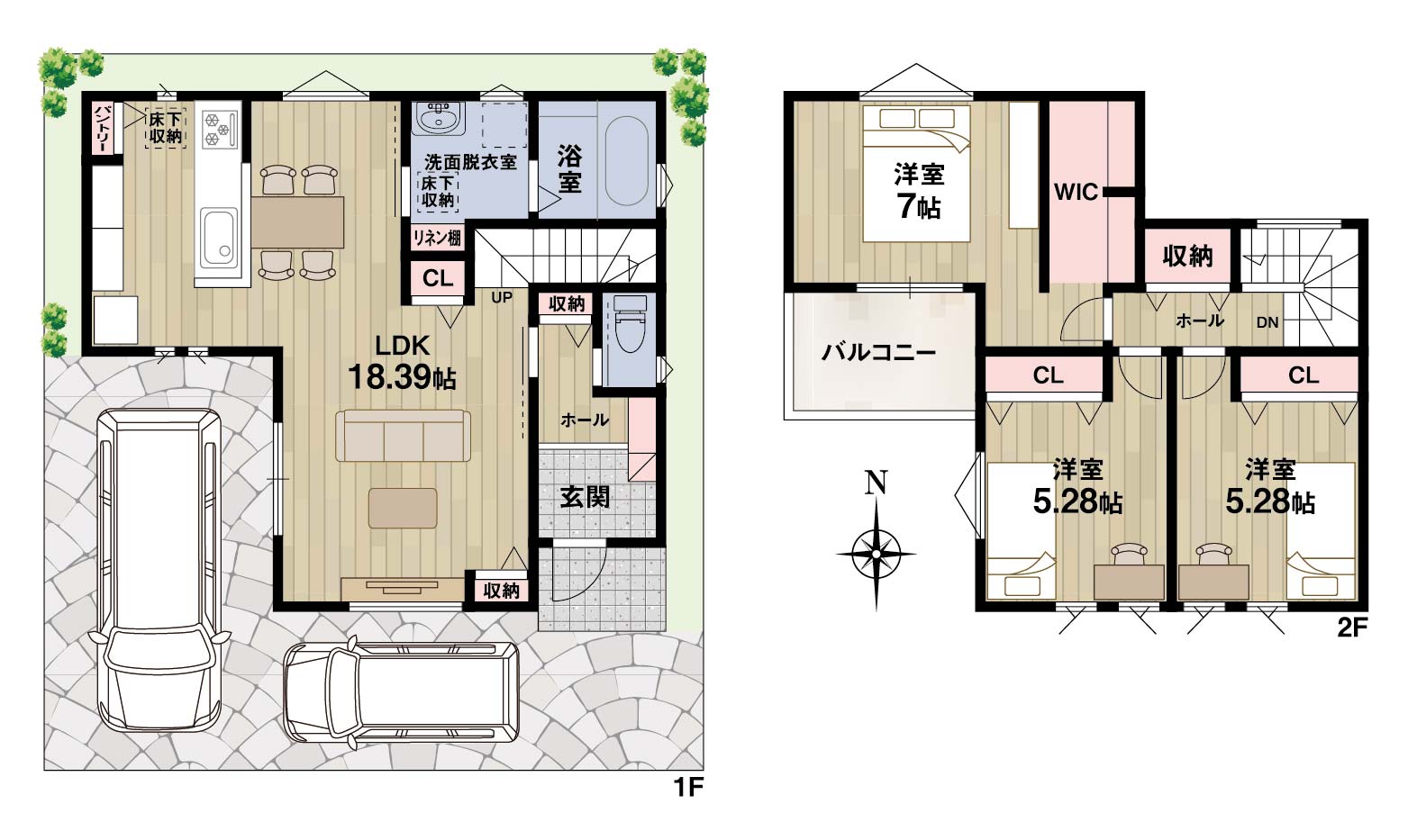 2台分の駐車スペースを確保可能です(車種による)。