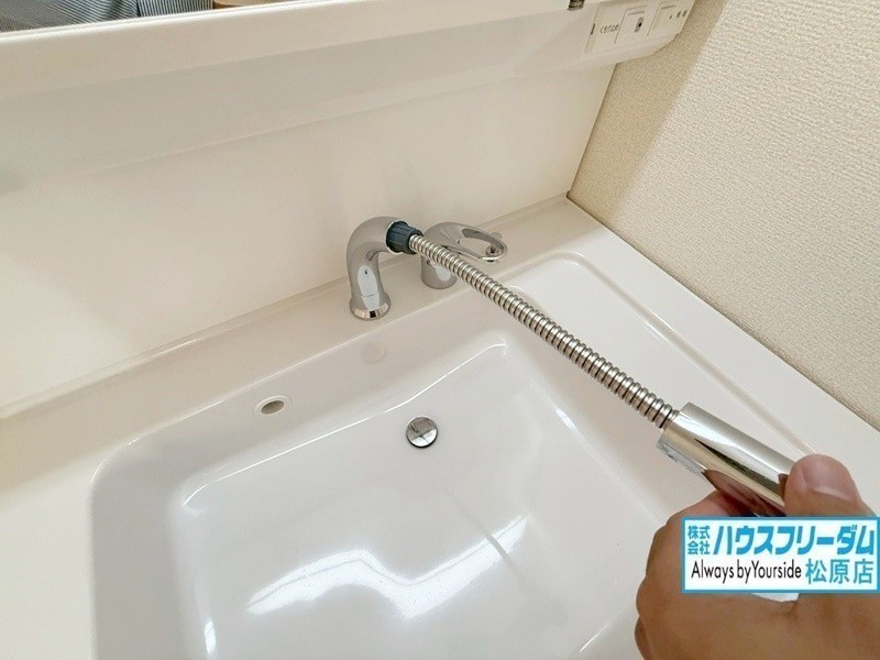 [洗面] シャワーホースが伸びるので隅々までお掃除できます。